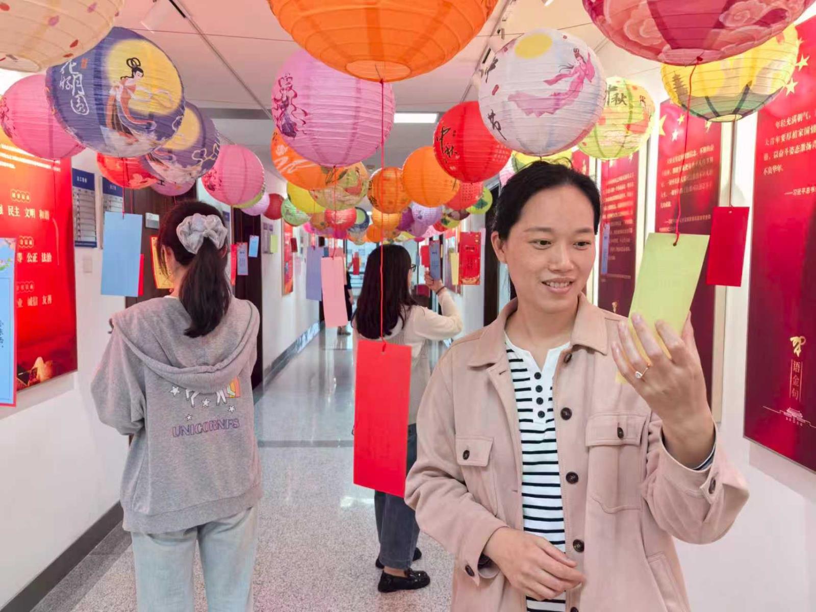 猜灯谜是中秋节的一项传统习俗,历史源远流长。活动现场,一个个彩色灯笼下面悬挂着一条条精心设计的谜语卡片,内容丰富,既具有娱乐性,又颇有知识性,除围绕中国传统文化这一主题设置有猜字谜、猜成语、猜地名之外,还准备了党史知识类和爱国主义类灯谜,为节日增添了一份浓浓的新意。